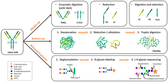 Monoclonal antibodies are characterized following intact, middle-up, bottom-up, and released N-glycans approaches that are schematically depicted in Figure 2. The sample preparation required is thoroughly discussed in this section.