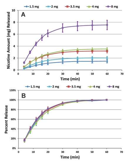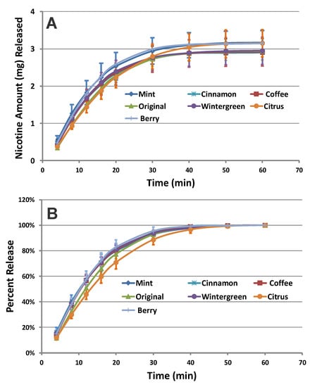Following method validation for oral nicotine pouches, we characterized the in vitro release profiles of nicotine from the 35 varieties of on!® nicotine pouch products. As an example of the release profiles measured, Figure 1 shows the cumulative release profiles (Figure 1A) and percent of total release (Figure 1B) of nicotine from on!® Mint pouches at five different nicotine levels (1.5, 2, 3.5, 4, and 8 mg per pouch). As expected, the cumulative nicotine released from the on!® pouches increases as the nicotine content of the product increases. The percent of total release profiles of nicotine from the on!® Mint pouches at various nicotine levels were equivalent (Figure 1B). More rapid nicotine dissolution was observed for all five products with a total percent release of ~80% in the profile region between zero and 20 min. The total percent of release for all products (>95%) was achieved within 40 min before the nicotine dissolution profiles reached a plateau. Despite differences in total nicotine content, on!® Mint pouches at various nicotine levels exhibit similar kinetic profiles. Similar observations were seen for the other flavor variants of on!® nicotine pouches including Citrus, Wintergreen, Coffee, Berry, Cinnamon, and Original across all five nicotine levels (Table 1).