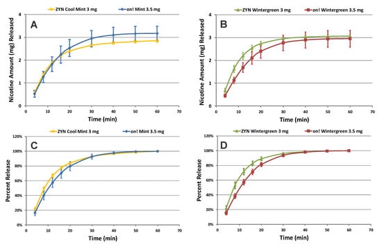 (A,B) Cumulative release and (C,D) percent of total dissolution release profiles of nicotine collected from Mint and Wintergreen on!® 3.5 mg and Cool Mint and Wintergreen ZYN® 3 mg pouches (n = 12) (Error Bars ± 1 SD).