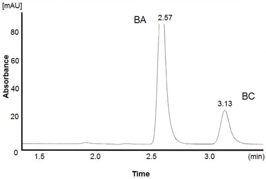Representative chromatogram of the working standard solution (reference solution) of BC and BA (50.0 and 100 μg/mL, respectively).