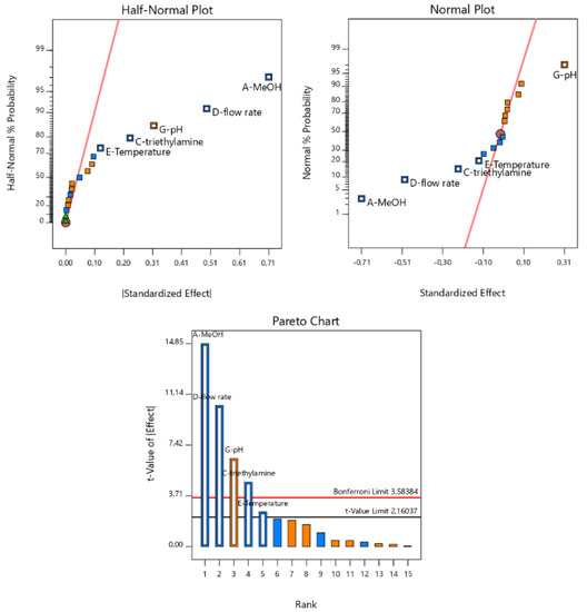 Alternatively, a graphical approach can also be employed to obtain an acceptable interpretation of the effects. The graphical identification of important effects is most commonly applied with a normal probability plot or a half-normal probability plot. These plots lead to similar conclusions—non-significant effects tend to fall on a straight line through zero, while significant effects deviate from it. Yet, a normal probability plot allows for determining whether a given effect is positive or negative, whereas a half-normal probability plot allows for comparing the magnitude, therefore the importance, of different effects. Finally, the Pareto charts constitute a useful tool in evaluating the influence of a factor on a response: the experimental factors which exceed the Bonferroni limit (upper line) are significant, while the ones that do not exceed the t-value limit (lower line) are non-significant. The factors between the two limits are potentially significant, and their characterization is subject to the analyst’s experience (Figure 2).