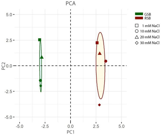 Data were analyzed by two-way analysis of variance (ANOVA) considering as fixed factors (i.e., categorical variables) the cultivar (C) and the NaCl concentration (S). The factor C had two levels represented by the GSB and the RSB cultivated varieties. The factor S had four levels, namely, 1, 10, 20, and 30 mM NaCl concentration in the NS. The Duncan multiple range test (respectively, the two-tailed Student’s t-test) was employed as a post-hoc procedure for mean separations for the NaCl concentration (resp., for the cultivar). Data are presented as mean ± standard error of the mean. Calculations were performed with SPSS 26 (IBM, Arkon, NY, USA). Principal component analysis was carried out and plotted in R as described [46].