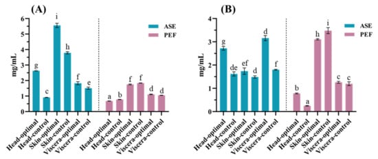 Protein content in the control and optimal PEF/ASE assisted extracts from fish by-products. (A) rainbow trout and (B) sole; PEF: pulsed electric fields; ASE: accelerated solvent extraction; Different lowercase letters (a–i) in the figure indicate statistically significant differences (p < 0.05).