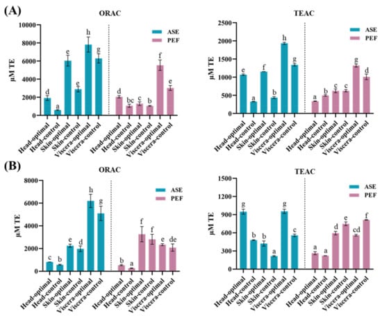 ASE also significantly increased the TEAC values of the extracts, which was about 1.7–2.0 times higher than that of the control group (without ASE). However, the impact of PEF on the TEAC values of the sole extracts was different from that found after applying ASE. For instance, PEF increased (p > 0.05) the TEAC values of the head extracts without any significant differences being observed. Two different methods have shown different effects on the antioxidant capacity of the extracts. Previously, the antioxidant capacity of the extracts without sterile membrane filtration was also measured []. Comparing the results before and after filtration, it was found that filtration had relatively little effect on the antioxidant capacity of the extracts, meaning the nutrients and antioxidant compounds in the extracts were well retained, which provides a basis for further experiments.