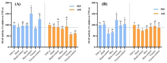 The NF-κB activation induced by TNF-α and the effect of fish by-product extracts using different treatment technology (PEF/ASE) were determined. (A) rainbow trout and (B) sole; the SEAP activity induced by TNF-α was considered to be 100%. PEF: pulsed electric fields; ASE: accelerated solvent extraction; Different lowercase (a–c) letters in the figure indicate statistically significant differences (p < 0.05).