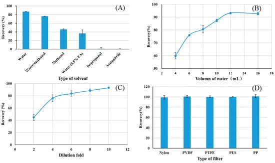 Optimization of the (A) type and (B) volume of extraction solvent; (C) effect of dilution fold; (D) type of filter (n = 3).