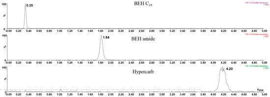 Chromatography columns were Hypercarb columns (2.1 × 100 mm, 5 μm) from Thermo Fisher Scientific (Bellefonte, PA, USA); BEH C18 column (2.1 mm × 50 mm, 1.7 μm) and BEH amide column (2.1 × 50 mm, 1.7 μm) were obtained from Waters (Milford, CT, USA). Guard columns of the same stationary phase were connected in front of the separation columns. All the columns were preconditioned according to the manufacturer’s instructions before use.