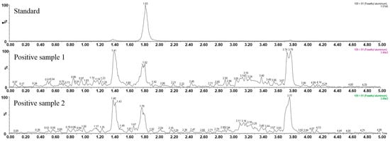 In order to study the applicability of the proposed method, the developed method was applied to analyze the fosetyl-Al residual in commercial wheat flour samples. In total, 75 samples were collected from four provinces that covered China’s main wheat flour production areas. For each kind of sample, the determination was repeated two times. Matrix-matched calibrations were injected in every sequence of samples in order to explore the carry-over effect and to ensure that a reagent blank was injected immediately after the highest standard. As a result, two samples were positive for fosetyl-Al, as shown in Figure 3. The signal intensity reflected that their concentrations were higher than the LOD and lower than the LOQ. One sample was produced in Shandong Province, the other was from Henan Province. All samples were below the maximum residue limits, suggesting that it is generally safe to consume wheat flour in China.