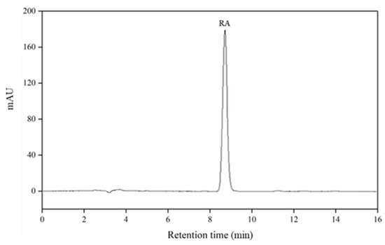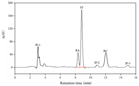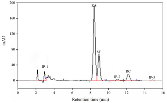 RA, ST, and RC were analyzed with HPLC. The quantitative analysis was performed on a high-performance liquid chromatographic system equipped with an LC-20AT pump, an SPD-M20A photodiode array detector, and a Class-VP workstation (Shimadzu, Kyoto, Japan). The analytical column was a Welch C18 (250 × 4.6 mm, 5 μm); mobile phase conditions: vacetonitrile/vphosphoric acid buffer solution = 32/68 (acetonitrile phosphate buffer); the flow rate of mobile phase: 1 mL/min; the detection wavelength: 210 nm; column temperature: 40 °C; the injection volume: 20 μL.