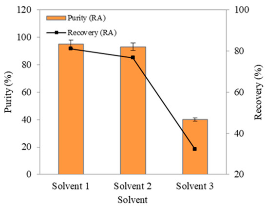 The crystallization solvent, solvent concentration, solid-liquid ratio, temperature, and time were investigated for the purity and recovery of the RA. The properties of a solvent have a great effect on the crystallization, and three alcohols (methanol, ethanol, and isopropyl) were usually used as the main crystallization solvents [13,21]. Different solvents were investigated, as shown in Table 2. The typical results of the alcohols are shown in Figure 2. The isopropyl led to the lowest purity, but high purity and recovery were obtained in methanol and ethanol. The crystallization process took 24 h in the ethanol solvent; thus, only 16 h were spent in methanol. Further, methanol was feasible as a crystallization solvent [13,20,21,23]. Therefore, the methanol aqueous solution was selected as the crystallization solvent in this research.