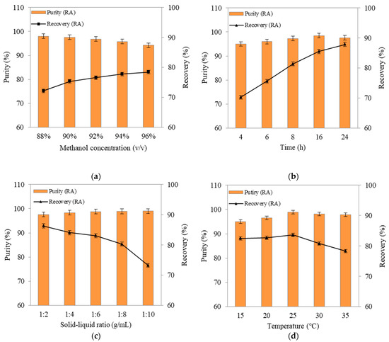 Effect of (a) MeOH concentration (16 h, 1:4 of the solid-liquid ratio, and 25 °C), (b) recrystallization time (90% of methanol concentration, 1:4 of the solid-liquid ratio, and 25 °C), (c) solid-liquid ratio (90% of methanol concentration, 16 h, and 25 °C), and (d) temperature (90% of methanol concentration, 16 h, and 1:4 of the solid-liquid ratio) on purity and recovery of RA.