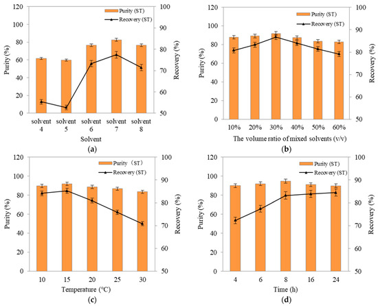 Effect of (a) solvent composition (1:6 of the solid-liquid ratio, 16 h, and 25 °C), (b) volume ratio of mixed solvents (1:6 of the solid-liquid ratio, 16 h, and 25 °C), (c) recrystallization time (1:6 of the solid-liquid ratio, the volume ratio of mixed solvent (solvent 3/solvent 1 = 30%), and 25 °C), and (d) temperature (1:6 of the solid-liquid ratio, the volume ratio of mixed solvent (solvent 3/solvent 1 = 30%), and 16 h on purity and recovery of ST from MLS.