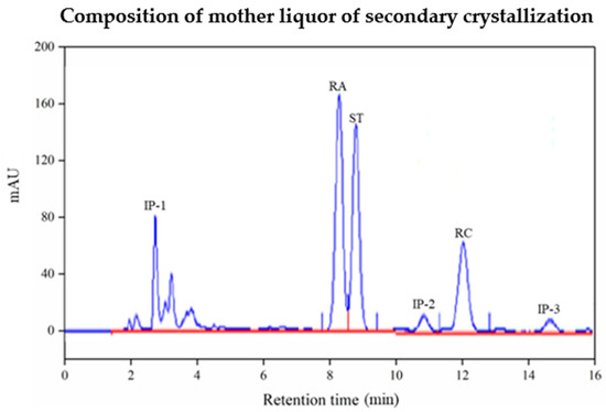 It can be seen from Figure 1 and Figure 8 that there is almost no RC precipitation through this method. According to the standard curve analysis, a 25.4% concentration in the liquid phase and near 100% total recovery after the second crystallization were achieved. That means that the RC was successfully enriched by more than three times compared with the crude stevia in Figure 1. Cheaper RC raw material could be provided for the subsequent preparation of very expensive and high-purity RC with this method.