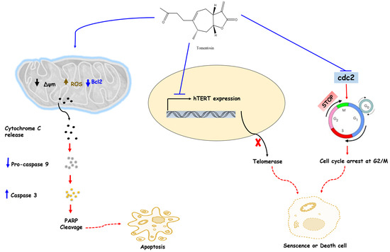 The anticancer potency of a compound can also be studied through its ability to shorten chromosomal telomeres [59]. Hence the objective of Merghoub and collaborators who, in addition to this ability examined for the first time with tomentosin, they studied its anti-proliferative effect on human cervical cancer cell lines (HeLa and SiHa cells) [47]. Indeed, the anticancer activity in this study was highlighted by several ways, namely cell growth inhibition, telomeric overhang elongation, morphological change expression, mitochondrial membrane potential (ΔΨm) depolarization, ROS generation, apoptosis-related proteins expression, caspase-3 activity, and cell cycle analysis) (Figure 2).