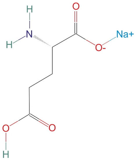 Various kinds of food additives (e.g., tartrazine, nitrites, monosodium glutamate) have been employed to improve the taste, tint, constancy, quality, and price of foods. For example, nitrites are a very well-described problem in food, because as a preservative, it causes many negative effects on human health [5]. Well-known monosodium glutamate (E-621, MSG) is a food additive; initially, it was used as a food flavor enhancer attributing a new kind of taste to some foods and was named “umami” [6]. It was discovered by a Japanese researcher more than a century ago and was extracted from dried kelp, which is a brown algae seaweed belonging to the Laminariales order [7]. Glutamate is one of the most abundant amino acids that exist in nature. Moreover, it is a fundamental element for the majority of tissues, peptides, proteins, and plays a crucial role in human metabolism, acting as a neurotransmitter [8]. Generally, glutamate arrives from different exogenous sources and mainly from the dietary flavoring agent MSG. Then, MSG is metabolized, providing free glutamate that does not differ biochemically from the endogenous ligand [9]. Hence, MSG has been approved approximately in all countries, but the toxicity versus the safety of MSG seems to be controversial. Some studies provided safety reports about that food enhancer [10,11]. However, other studies demonstrate the deleterious impact on laboratory animals [6,8,9,11,12,13,14,15,16,17,18,19]. Moreover, in humans, the ingestion of repeated high doses of MSG can trigger an elevated frequency of nausea and headaches [20].