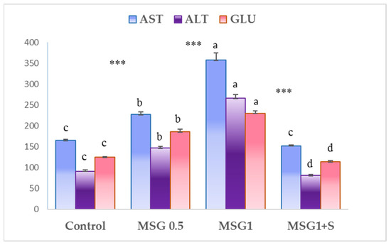 Data were analyzed using JMP 12 statistical software (SAS Institute, 2014) [52]. The normal distribution of the measured variables/parameters (AST, ALT, glucose, cholesterol, triglyceride, creatinine) was checked by Shapiro–Wilk tests. The average for each parameter is the arithmetic mean of five replications, and it was analyzed through an analysis of variance ANOVA model (JMP version 12, SAS Institute, Cary, NC, USA) that included terms for hematological parameters. Treatment means among groups (control, MSG 0.5, MSG1, and MSG1 + S) were determined using Tukey’s HSD test at the 0.05, 0.01, and 0.001 probability levels.