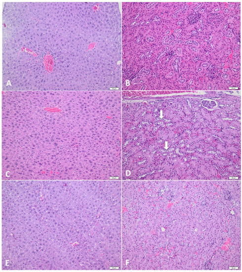 The histological analysis of the kidneys and liver were realized in order to investigate possible tissue injuries. The liver and kidney samples were maintained in a phosphate-buffered formalin substance for 24 h and then were embedded in paraffin wax [48]. Afterward, liver and kidney samples were cut into sections of 3 µm and stained with hematoxylin and eosin (H&E). Each section was individually analyzed with two veterinary pathologists (MT and CT) by using a light Olympus BX-41 microscope [49]. The photomicrographs were realized using an Olympus SP 350 digital camera and Stream Basic imaging software (Olympus Corporation, Tokyo, Japan) [50]. When the researchers had contrasting opinions, an additional diagnosis was made through simultaneous evaluation in a five-head microscope (Zeiss Axio Scope A1) [51] All samples were subjected to histological changes that included degenerative processes, necrosis, inflammation, fibrosis, and cell proliferation.