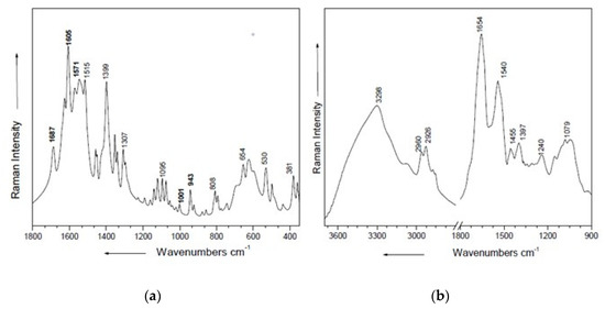 Figure 3 presents the FTIR spectrum of MSG (a) and spirulina powder (b) analyzed bands, which were compared to the similar molecule bands obtained by other authors [65,66,67]. Our result showed that the basic amino group of MSG could have joined to one of the two-carboxyl groups or formed an internal salt with the amine as in the case of amino acids.
