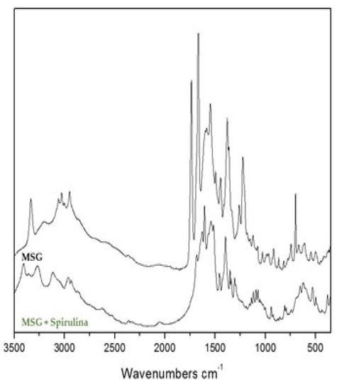 Comparison of FTIR spectrum of MSG and MSG combined with spirulina.