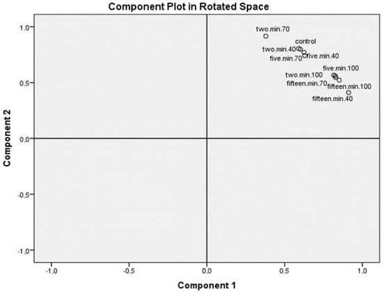 The influence of conventionally used pasteurization methods on the antioxidant activity of watermelon juice by the FRAP method was also investigated in the study where the samples were treated at 75 °C for 3 min []. The results of the study showed a decrease of 25% in the reduction of iron ions compared to the unheated sample, which is comparable to the result of the sample number 5 that was exposed to a temperature of 70 °C for 2 min. This sample showed 27% decrease in the antioxidant activity. A decrease in the values of antioxidant activity was also recorded for samples number 8, 9, and 10 that were exposed to the highest temperature of 100 °C. For samples number 8 and 9, a decrease of about 49–60% was recorded.