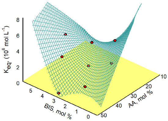 The binding affinities for ciprofloxacin calculated from Langmuirian binding models (the results of which are reported in Table S2, Supplementary Materials) were fitted against the molar percentages of AA and tBAM by using a six-parameter polynomial model. The response surface, reported in Figure 1, fits quite well with the experimental design points used in the design, with r2 = 0.921 and fit standard error = 0.607 (see Table S3, Supplementary Materials). Less complex five- or four-parameter designs that were lacking in interaction or quadratic parameters were discarded because they produced response surfaces with lower correlation coefficients (r2 < 0.8) and higher fit standard errors (>1–2), As the polynomial model that was used provides an interaction term between the independent variables (parameter a5 in Table S3), the resulting surface shows an obvious saddle shape, with two distinct regions where the binding affinities are higher and an intermediate region with a saddle-centered maximum where the binding affinities are lowest. It should be noted that the formulation of the polymerization mixture previously reported in literature [26] corresponds to a response surface region characterized by high binding constants. For these reasons, several polymers with very different molar composition were potentially suitable to set up a MISPE protocol with, among which we have chosen the formulation P6, which corresponds to nanoMIPs with high affinity (3.00 ± 0.75 × 106 M−1) and binding site concentration (18.8 ± 2.9 nmol g−1).