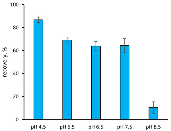 In order to optimize the procedure of fluoroquinolone extraction, we initially focused our attention on the composition of the loading and washing solutions. Synthetic urine containing 200 ng mL−1 of ciprofloxacin was diluted 1 + 9 with buffers of different pH levels. As reported in Figure 2, there is a clear effect of the buffer’s pH on the retention of ciprofloxacin, as the acidic buffer shows a limited loss of analytes while the neutral and basic pH buffers do not quantitatively retain them. This result confirms the results reported in literature, where ciprofloxacin-binding nanoMIPs show binding constants decreasing when pH increases [26].