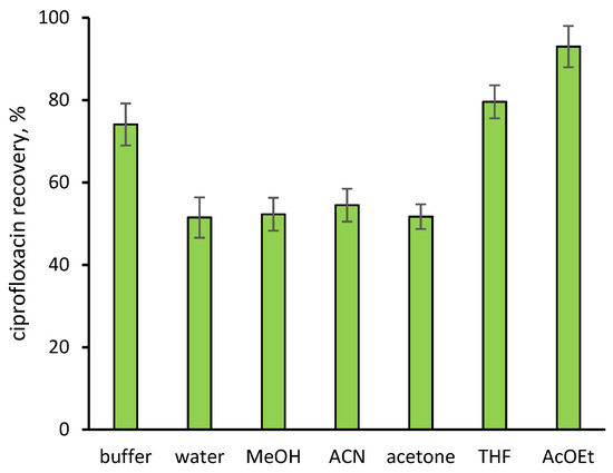 Once optimal loading conditions were defined, we evaluated the effect of the washing solutions; considering 1 mL of water, an MES buffer at pH 4.5 and organic solvents of decreasing polarity (methanol, acetonitrile, acetone, tetrahydrofuran and ethyl acetate). As reported in Figure 3, none of these solutions, with the exception of the less-polar ethyl acetate, is capable of quantitatively retaining ciprofloxacin. It should be noted that the loading buffer is also unable to fully retain the analyte, even if the loss is significantly less (~25%) than that of all of the other solutions. As a consequence of this result and taking into account that, by eluting the cartridges loaded with real urine samples with ethyl acetate, the corresponding chromatogram does not show any peak whatsoever, it was therefore decided to omit the washing step, limiting the process to drying the cartridges carefully after loading the sample.
