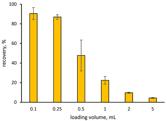 The effect of increasing the loading volumes was evaluated considering samples of synthetic urine spiked with ciprofloxacin at a fixed concentration of 200 ng mL−1 and diluted 1 + 9 v/v with 50 mmol L−1 of MES buffer. The results, reported in Figure 4, show that when the loading volumes are larger than 0.25 mL, the recovery of the analyte drops sharply, becoming very small when 5 mL of the sample is loaded. This is unexpected, as the nanoMIP P6 that was used to prepare the MISPE cartridges shows a binding site concentration of 18.8 ± 2.9 nmol g−1. This is a static binding capacity of ~6 µg/cartridge of ciprofloxacin, corresponding to 60 times greater than the amount present in 5 mL of the sample. The cause of this poor loading capacity is unclear, but, in any case, a loading volume of 0.25 mL ensures a good retention of the analyte in the MISPE protocol reported here.