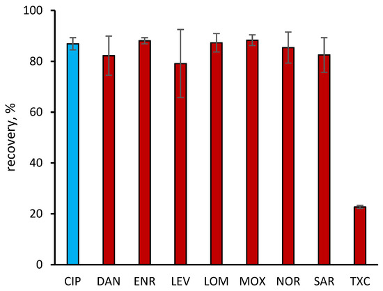 The results, reported in Figure 5, show that the imprinted cartridge is able to retain all of the examined fluoroquinolones with recovery rates greater than 80%, while chlortetracycline (an antibiotic substance with a molecular structure completely different from that of fluoroquinolones) is poorly retained. The group selectivity shown by the nanoMIPs can be explained by considering that the positions on the rigid molecular structure of the fluoroquinolone, which presumably are most responsible for the interaction with the binding site, correspond to the positions C3 (carboxyl) and C4 (quinone); these are far from the positions N1 and C7 that determine structural differences. It follows that the significant molecular recognition of all fluoroquinolones is essentially determined by the presence of some ubiquitous structures on this class of molecules. These ubiquitous structures are the condensed ring systems that give shape and size to the binding site and the presence of the carboxyl-quinone system in positions C3-C4, which guarantees the same non-covalent interaction mechanism for all molecules. Moreover, it is clear that the basic shape of the ligands is equally important. Chlortetracycline, which possesses a pair of substituents in the C1-C2 positions (similar to the carboxyl-quinone system) but exhibits a radically different condensed ring system, is poorly recognized by nanoMIPs.