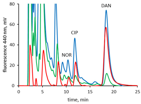 HPLC chromatogram of human urine spiked with ciprofloxacin, danofloxacin, and norfloxacin at final concentration of 2 µg mL−1 and diluted 9 + 1 v/v with 50 mmol L−1 MES buffer, pH 4.5. Blue line: sample injected without MISPE; green line: not retained eluate from MISPE cartridge; red line: eluate from MISPE cartridge.