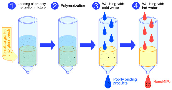 An innovative approach to solving all of these issues is presented by the solid phase synthesis of nanoMIPs [11,12]. In this process, illustrated in Scheme 1, the polymerization process takes place in the interstitial space between packed glass beads that are covalently grafted with template molecules. The growth of cross-linked polymeric chains takes place in proximity to the glass beads’ surfaces, resulting in the imprinting of the nascent nanoparticles by the grafted template molecules. At the end of the polymerization process, any residual monomers, polymerization by-products and low-affinity polymers are washed away, whilst the high-affinity nanoMIPs are recovered by washing with a solution capable of breaking the non-covalent molecular interactions between the imprinted nanoparticles and the grafted template molecules. This solid phase synthesis technique addresses many of the drawbacks of traditional solution-synthesis techniques. In fact, because the template molecules are covalently grafted onto the glass beads, no residual template molecules are present in the nanoMIPs, avoiding the bleeding effect entirely. Moreover, as the functionalized glass beads require a small amount of the template and can be cleaned and reused many times, this approach allows the use of expensive templates. Additionally, in the case of toxic or harmful substances, the confinement of the reaction to the glass beads’ surfaces eliminates any health risks during the manipulation of the solid phase [13].