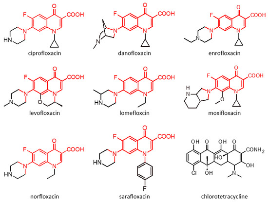 Template, fluoroquinolones with similar molecular structure and chlortetracycline. In red: the fluoroquinolone nucleus preserved in all the analytes considered.
