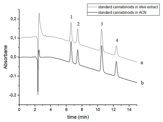 Chromatograms of four cannabinoids - CBDA, CBD, CBN and Δ9-THC—(a) in an olive extract and (b) in acetonitrile (ACN). The compounds were detected at λ = 220 nm. 1—CBDA, 2—CBD, 3—CBN and 4—Δ9-THC.