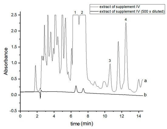 Chromatograms of the analyzed oil-resin supplement IV- (a) original extract and (b) 500 times diluted extract. The compounds were detected at λ = 220 nm. 1—CBDA, 2—CBD, 3—CBN and 4—Δ9-THC.