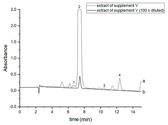 Chromatograms of the analyzed oil supplement V- (a) original extract and (b) 100 times diluted extract. The compounds were detected at λ = 220 nm. 1—CBDA, 2—CBD, 3—CBN and 4—Δ9-THC.