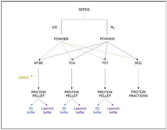 Workflow of experiments. ICE: powder produced by holding the mortar on ice (4 °C), N2: powder produced in the presence of liquid nitrogen. MTBE: total protein extraction after delipidation with MTBE: MeOH; TCA: total protein extraction after precipitation in TCA/acetone; TOT: total protein extraction after delipidation with hexane; SEQ: sequential protein extraction after delipidation with hexane.