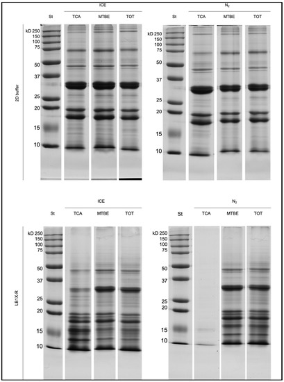 Regarding the two cooling methods (ICE vs. N2), no signs of protein degradation were observed, which could be revealed by an increase in the number of low MW bands. However, ICE extracts show minor bands that are less evident in N2 extracts. Besides, the ICE method was more efficient than N2 when combined with TCA/acetone precipitation and LB1X-R solubilization, where the protein profile is almost absent. In fact, after solubilization, these samples had a pH of 3 and needed to be neutralized with NaOH, but this procedure did not provide an efficient protein separation.