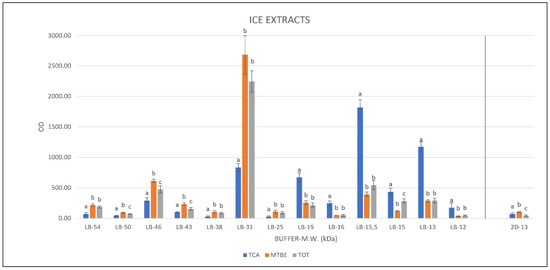 Histogram representing the optical density (mean ± standard deviation), of SDS-PAGE protein bands with at least 2-fold differences among ICE extracts obtained with TCA, MTBE and TOT methods. The grey vertical bar divides LB1X-R (left side) from 2D-buffer solubilized samples (right side). Significant different values (p-value < 0.05) are indicated by different letters.