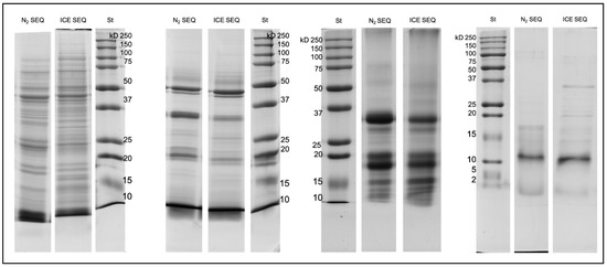 The result of sequential extraction is shown in Figure 4. The pattern of the albumin fraction of N2 extracts has fewer bands above 100 kDa, between 30–25 and 20–15 kDa when compared with ICE extracts.