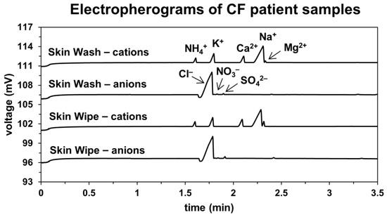 The analysis of the sweat samples was performed on a commercial CE instrument with a C4D. The previously optimized BGE consisting of 20 mmol/L His, 20 mmol/L MES, 2 mmol/L 18-crown-6 and 30 µmol/L CTAB at pH 6 was used. CTAB was used to suppress the electroosmotic flow and reduce the analysis time of the anions. The analysis took 3.5 min for cations and anions, respectively, totaling about 10 min including the injection and washing steps. The same system and BGE were used for analysis of anions and cations, except that the polarity of the high-voltage power supply was switched from positive (cations) to negative (anions). Total analysis time can be significantly reduced by using short capillaries in an in-house built system, as documented in several previous publications [19,20,21]. Figure 3 shows a typical electropherogram of a skin-wipe and skin-wash sample from a CF patient with both anions and cations separated. The traces of both methods are very similar, proving the suitability of the developed skin-wash method. However, because the absolute amounts of the ions in each sample are different, a specific dilution was used for each sample. Typically, the conductivity of each sample was measured prior to dilution and the dilution was performed according to the measured value to fit within the calibration curve. Calibration was measured for all anions and cations in the range of 0–50 µmol/L with the analytical parameters shown in Table S4 in the Supplementary Material. All other parameters such as limits of detection, limits of quantitation and repeatability of migration times and peak areas were previously validated [14].