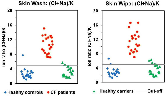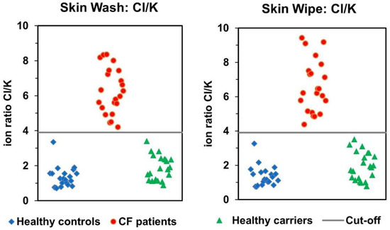 The previously calculated cut-off value of 5.0 was then applied for all samples, with the extended ion ratio ((Cl− + Na+)/K+). Figure 5 shows that using the new skin-wash method, two studied subjects (one healthy and one CF carrier) would be incorrectly classified, and all CF patients were correctly classified, resulting in 100% sensitivity and 95.4% specificity. Using the skin-wipe sampling method, the number of false positives would be higher, especially in the healthy carrier group, demonstrating the advantage of using the new skin-wash sampling method. Although the sensitivity would be 100% again, the specificity would drop to 88.4% using skin-wipe sampling. The reason for the superiority of the new skin-wash method might be the lower contamination. We have noticed that although cleaned carefully, a small contamination with ions (especially sodium and calcium cations) could be observed in the cotton swabs. The higher contamination with Na+ cations might have caused a decrease in the specificity of the skin-wipe method. However, even with the combined ion ratios, all patients with CF were again classified correctly, which is the ultimate goal of any screening method.