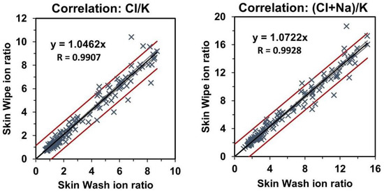 To validate the newly developed skin-wash method, the ion ratios obtained for the skin-wash method and for the skin-wipe method were compared and plotted in a correlation graph. The results of both sampling approaches are shown in Figure 6. The correlation matrix consisted of Cl−/K+ ion ratios (Figure 6, left panel) and of ((Cl− + Na+)/K+) ion ratios (Figure 6, right panel) from all 65 samples from all study groups, left and right hand samples separately. The uncertainties of the coefficients of the slope and the intercept were calculated and a t-value (Student’s t-test) for the intercept was obtained. The t-value was compared to corresponding critical value, and it was found that the intercept is statistically insignificant. The Pearson correlation coefficients (R = 0.9907 for the Cl−/K+ ion ratio and 0.9928 for the ((Cl− + Na+)/K+) ion ratio) demonstrate an excellent correlation between the two methods.