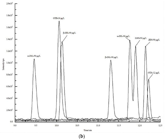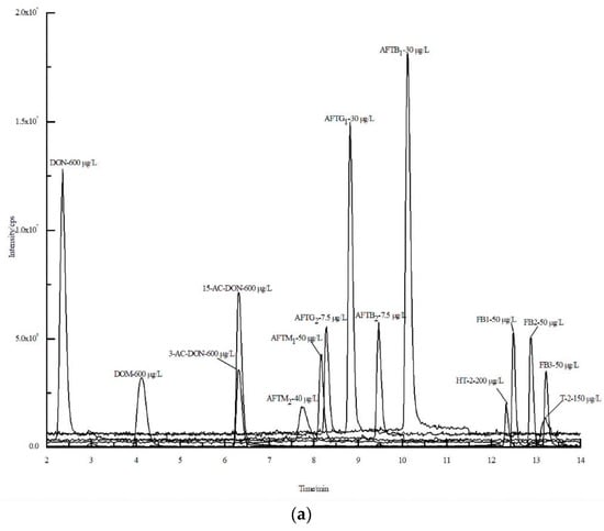 AFTB1 (2 µg/mL), AFTB2 (0.5 µg/mL), AFTG1 (2 µg/mL), AFTG2 (0.5 µg/mL), AFTM1 (0.5 µg/mL), AFTM2 (0.5 µg/mL), FB1 (50 µg/mL), FB2 (50 µg/mL), FB3 (50 µg/mL), DON (100 µg/mL), DOM (25 µg/mL), 3-ADON (100 µg/mL), 15-ADON (100 µg/mL), T-2 toxin (100 µg/mL), HT-2 toxin (100 µg/mL), STC (50 µg/mL), OTA (10 µg/mL), OTB (10 µg/mL) were purchased from Romer Labs Co., Ltd. (Tulln, Austria). ZAN (100 µg/mL), ZEN (100 µg/mL), α-ZAL (100 µg/mL), α-ZEL (100 µg/mL), β-ZOL (100 µg/mL), and β-ZOL (100 µg/mL) were purchased from Anpel Co., Ltd. (Shanghai, China). Chicken breast, liver and kidneys were purchased from local super market.