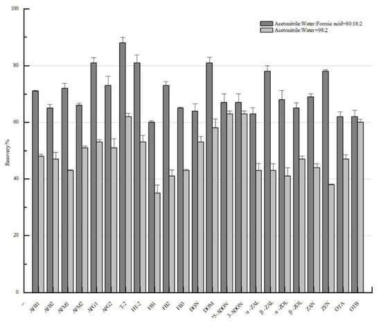 The effect of different extracts on the recovery of each mycotoxin.