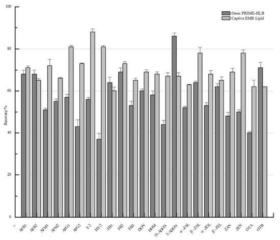 Chicken breast meat which was cheap and easily available were widely consumed. Chicken liver and gizzard were the characteristic Chinese food. Considering 1.4 billion Chinese people, the method development was of great importance. As for different matrices of chicken breast meat, liver and gizzard, a great certain of proteins, lipids and minerals would be retained in the extraction solution, which brought in interference to mycotoxin determination. Besides, different mycotoxins would have different physicochemical properties. Therefore, it would be of great necessity to develop the method which would be suitable for multiple mycotoxins. In this study, two multifunctional purification cartridges were investigated for the purification effect of 23 mycotoxins, such as Oasis PRIME-HLB and Captiva-EMR Lipid purification cartridges, whose purification effects on mycotoxin recoveries were shown in Figure 3. Both of those two columns allowed direct sample loading without equilibrium and activation and belonging to filtering SPE cartridge for the impurity removal, which greatly simplified the procedures of SPE and effectively decreased sample treatment time [24,25]. Captiva-EMR Lipid purification cartridge also had a higher absorptive capacity and removal efficiency of lipids. According to the response after the purification by Captiva EMR Lipid and Oasis PRIME-HLB cartridges, recoveries of 23 mycotoxins with the pretreatment of Captiva EMP Lipid cartridge were acceptable, namely 61–111%, wherein FBs also demonstrated good results. Thus, in this work, the Captiva-EMR Lipid purification cartridge was chosen.