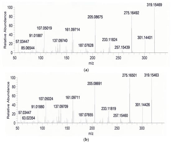 MS2 spectra of ZEN in the standard solution (a) and contaminated sample (b).