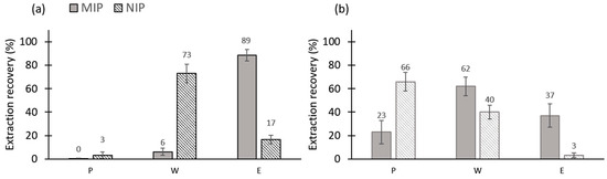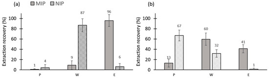 Repeatability of the extraction procedure obtained when percolating: (a) CLD and (b) CLD-OH in pure media on the MIP/NIP 2 (n = 3). Percolation (P): 1 mL ACN spiked at 200 µg L−1 with each compound; washing (W): 1 mL of ACN/MeOH, 95/5, v/v; Elution (E): 3 mL MeOH.