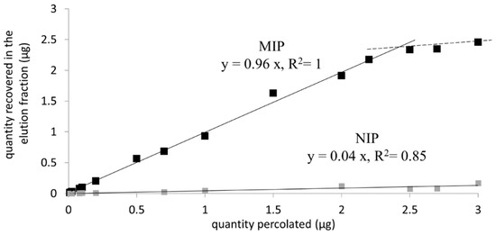 In order to complete the characterization of the MIP/NIP 2 in pure medium, its capacity was evaluated by percolating increasing amounts of the targeted compound CLD. The capacity corresponds to the maximum amount of a targeted compound that can be retained by the MIP with a constant extraction recovery in the elution fraction. Figure 4 represents the amount of CLD determined in the elution fraction of MIP 2 and NIP 2 as a function of the amount percolated on the corresponding sorbent. The curve obtained for MIP 2 presented a linear part from 5 ng to 2.2 µg of CLD percolated on 35 mg of MIP. It demonstrated the linearity of the response (96% of extraction recovery in the elution fraction) in this range. Then, the slope of the curve strongly decreased and the intersection of both parts of the curve allowed for the determination of the capacity (saturation of the specific cavities of the MIP) at 62.8 µg/g, i.e., 0.13 µmol g−1. This value was slightly lower than the capacity values generally reported after the radical polymerization of organic monomers (1–40 µmol/g) [39]. However, this capacity was sufficient to apply MIP to naturally contaminated serum samples. The slope of 4% observed for NIP 2 corresponded to the retention of CLD by non-specific interactions and was consistent with the mean extraction recoveries in the elution fraction previously obtained for the percolation of samples spiked at 200 µg L−1 in pure medium (7 ± 6%). This slope was also similar to the one of the second part of the curve obtained for the percolation of large amounts of CLD on MIP 2, which is explained by the fact that, once the capacity was reached, i.e., the cavities were saturated, the retention of the excess of CLD was also performed by non-specific interactions.