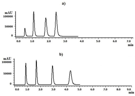 Table 1. The table shows that the monolithic column has advantages with concerning theoretical plate number, HETP, and resolution. Furthermore, to separate the analytes in a shorter run time, different flow rates were tested on the two chromatographic columns.