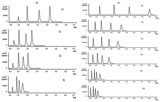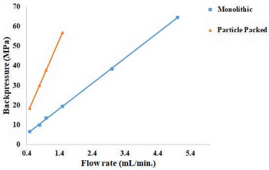 Figure 5 shows the effect of a large flow rate on the backpressure of the two columns. Since there are two kinds of pores, flow pores, and mesopores, high flow rates can be applied in monolithic columns. The permeability of the monolith is due to the large flow pores, which permit the separation of analytes at large flow rates with minimal backpressure. The inner pores of the particle-packed column correspond to the mesopores in the monolithic column. Therefore, in comparison with a particle packed column with similar efficiency, rapid separation can be achieved at a high flow rate of the mobile phase and moderate back-pressure.